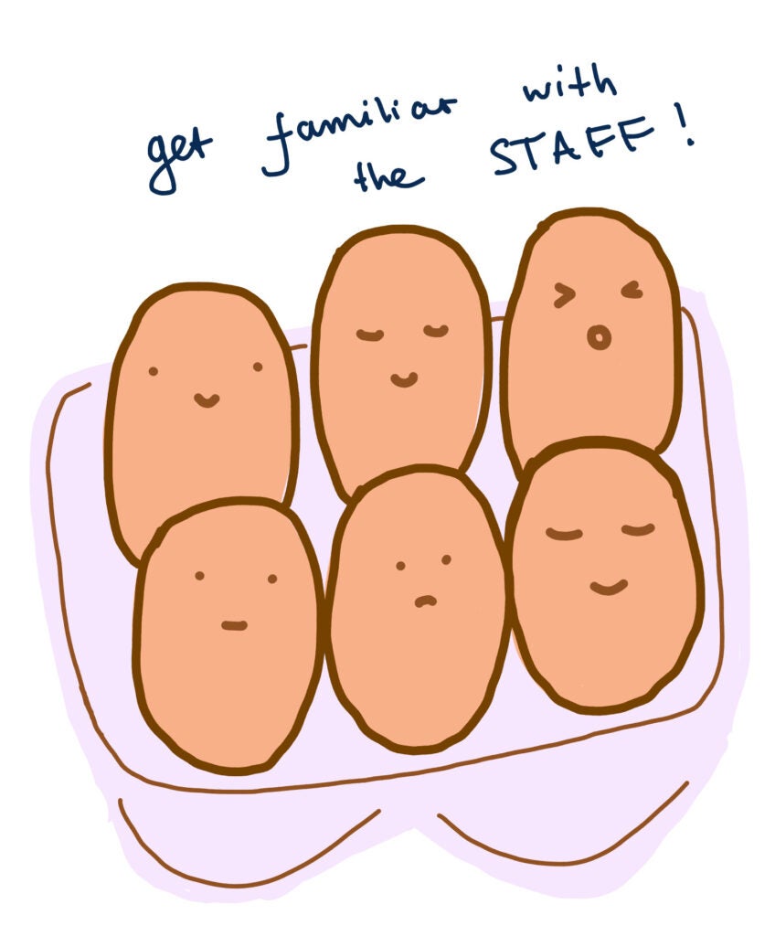 Now, how could we make the pancakes without eggs? Eggs are the building block – just like getting familiar with the staff & utilizing available resources. When I have a free minute in my calendar, I book appointments with different departments and student workers: Writing Center, Careers, Wellness, and more.