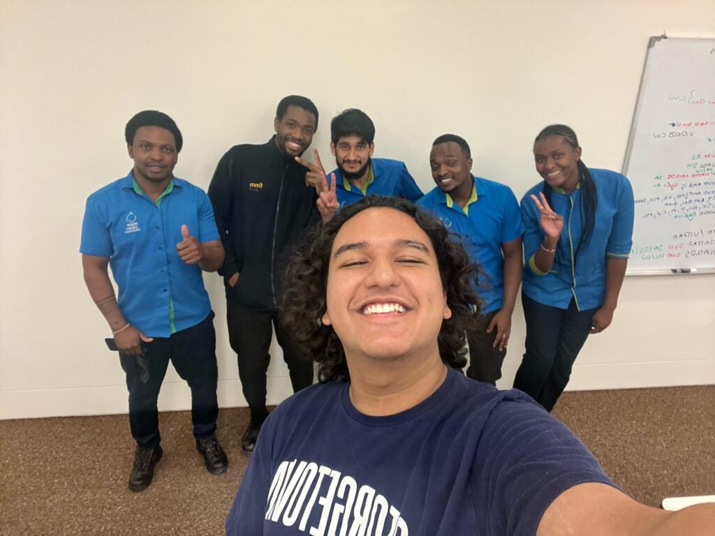 Student instructor Pragyan Sharma (GU-Q’28) with Warui Lawrence, Duke Kisala, Awais Tayyab, Joseph Kangethe, and Ruth Ogega