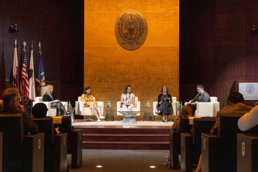 The conference’s final panel featured GU-Q Writer-in-Residence Kamila Shamsie in conversation with award-winning author Imbolo Mbue. Conference co-organizer Dr. Victoria Googasian noted that Mbue’s novel How Beautiful We Were provided an early inspiration for the conference, because “it turns an unsettling eye to the way the imperial commitment to oil extractivism rebounds across generations, linking past and future.”