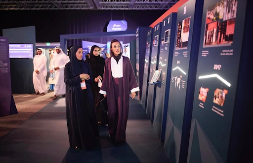 Reem on air with Sheikha Haya, and walking HH around the WISE exhibit.